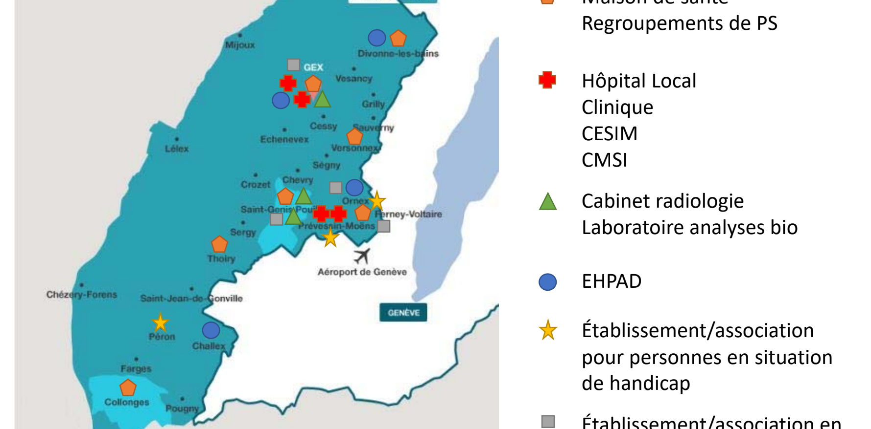 6 Maisons de Santé sont répartis sur le Pays de Gex dans les communes de Collonges, Divonne-les-Bains, Prévessin-Moëns, Thoiry et Versonnex.